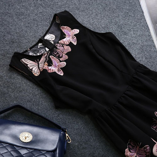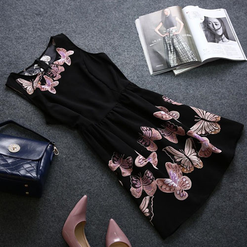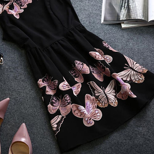 gathered waist design,simple but delicate. And its butterfly printed pattern makes it look