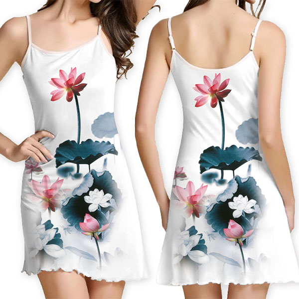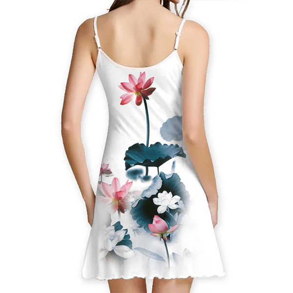 Easily to achieve for a sweet and charming style with this dress. Sling style,the lotus printed pattern design