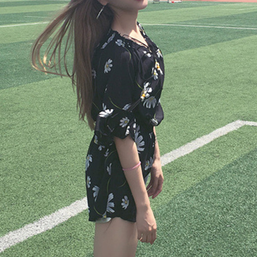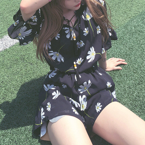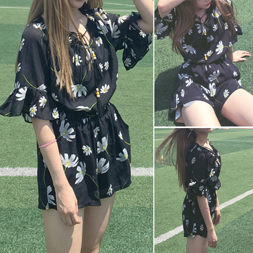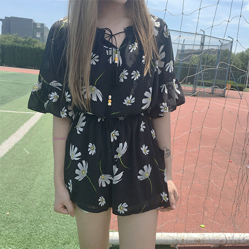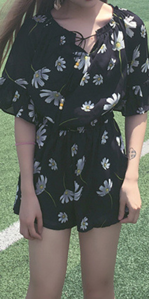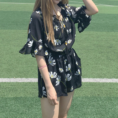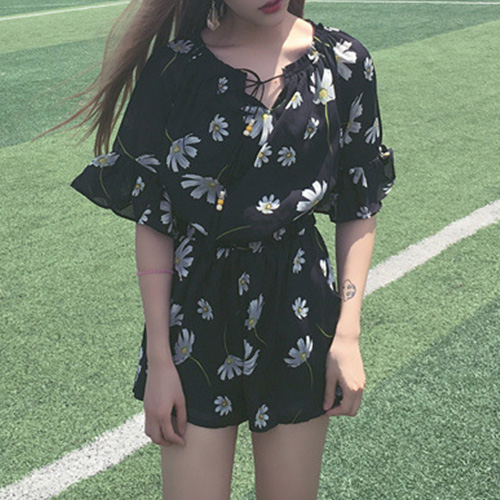 Sweet Style Lotus Sleeve Printed Chiffon Rompers