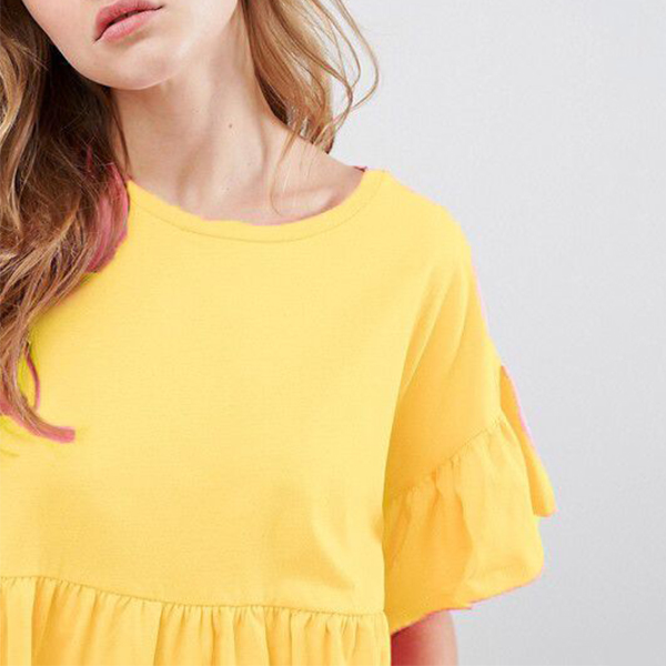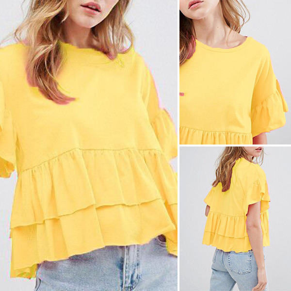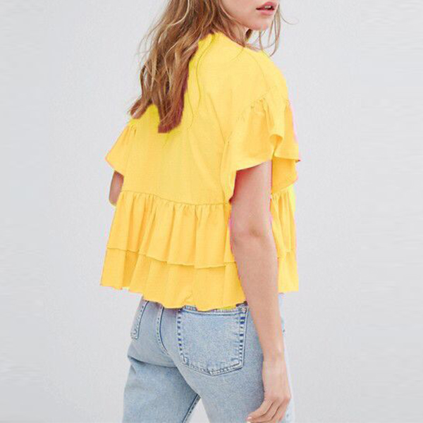 Features a bright yellow tone,this blouse can make your day more brighter and playful. Its lotus sleeve and ruffle hem design