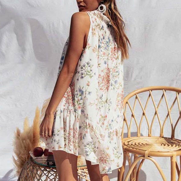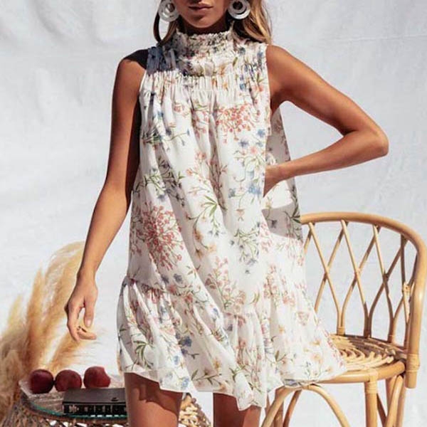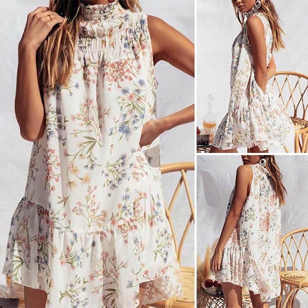 finished with sleeveless,stand collar and a loose silhouette,this dress can easily enhance your feminine