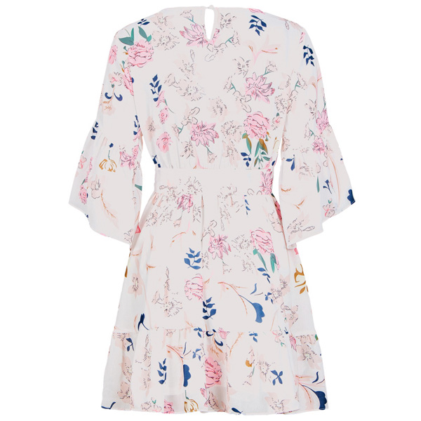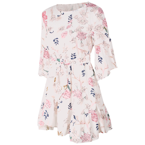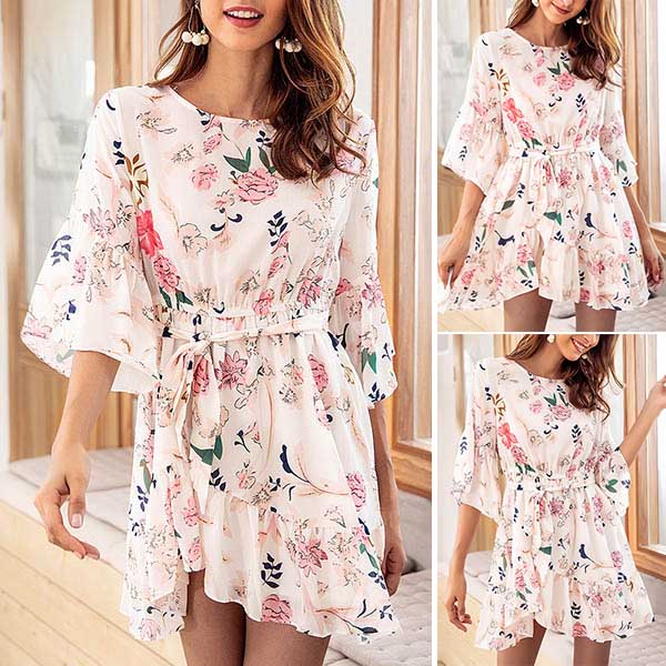 Boasts vibrant floral print,finished with trumpet sleeve,round neck and an irregular ruffle hem,sweet and charming.
