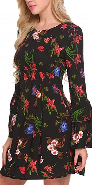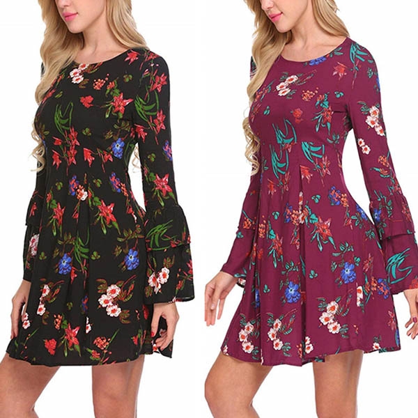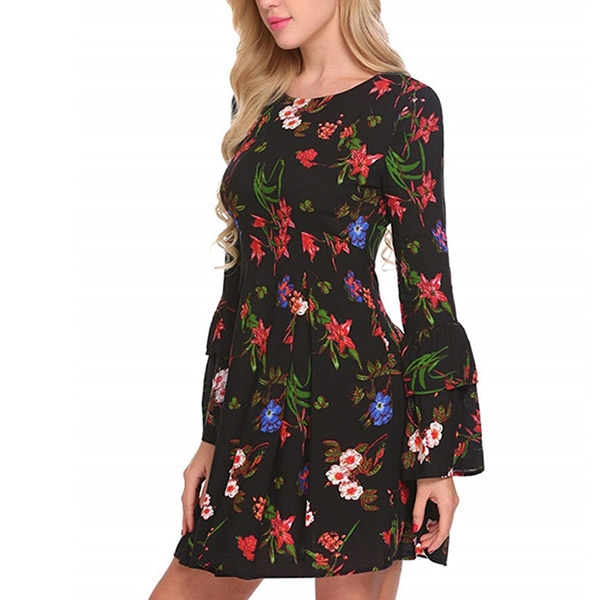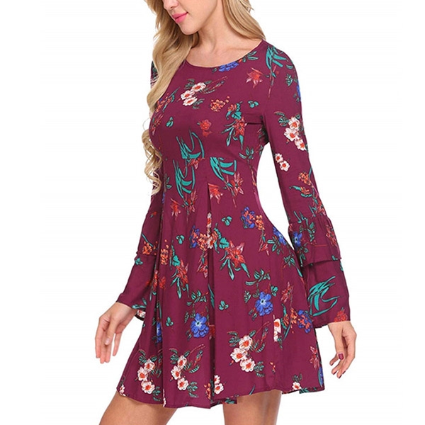 Sweet Style Trumpet Sleeve Round Neck Printed Dress