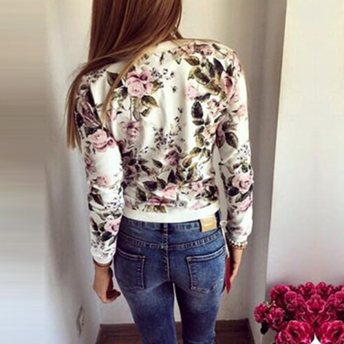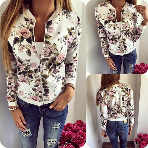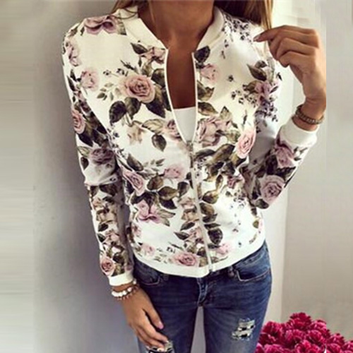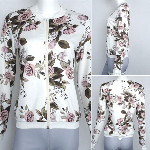 Trendy Flowers Printed Front Zipper Long Sleeve Coat For Women(It falls small)