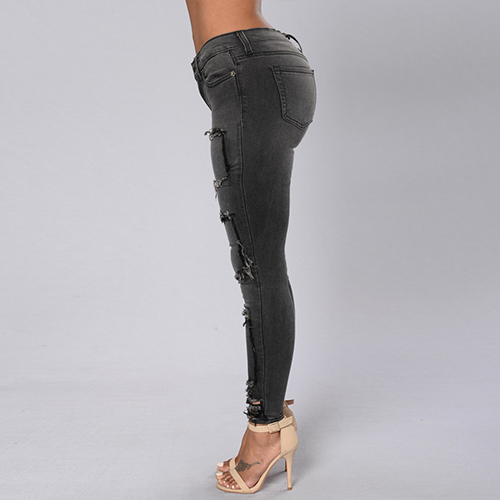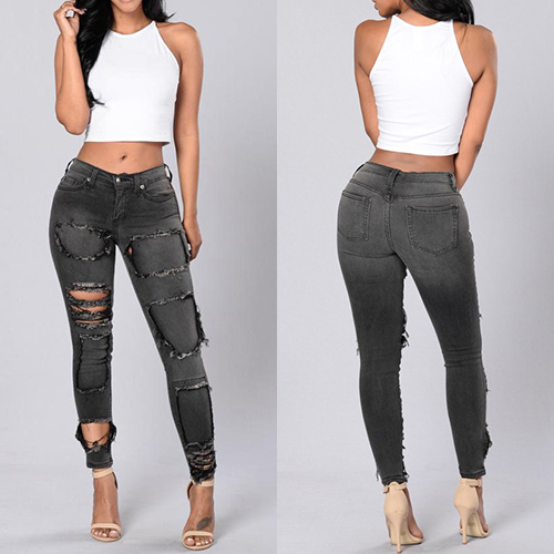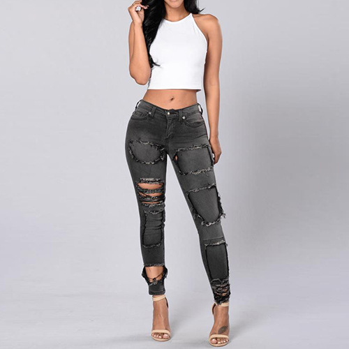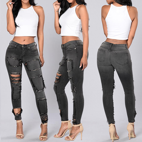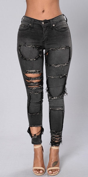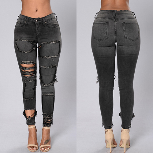 With a retro style, this bluish black jeans features low-waist and ripped design which can bring