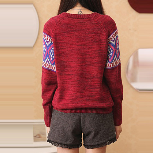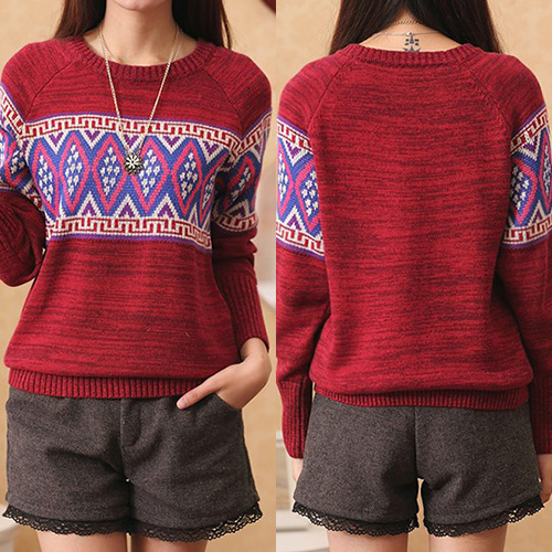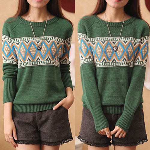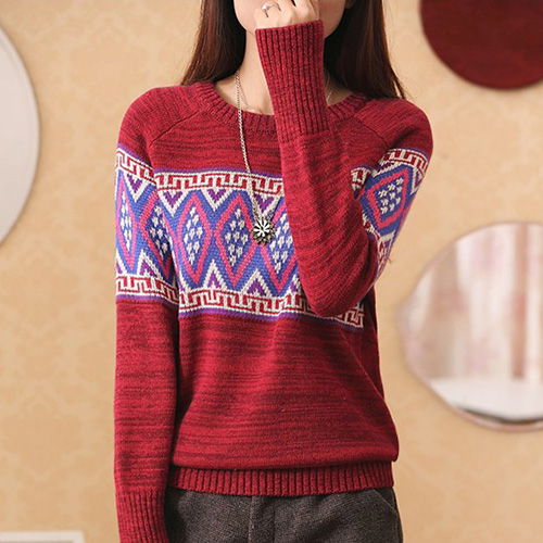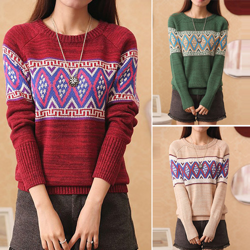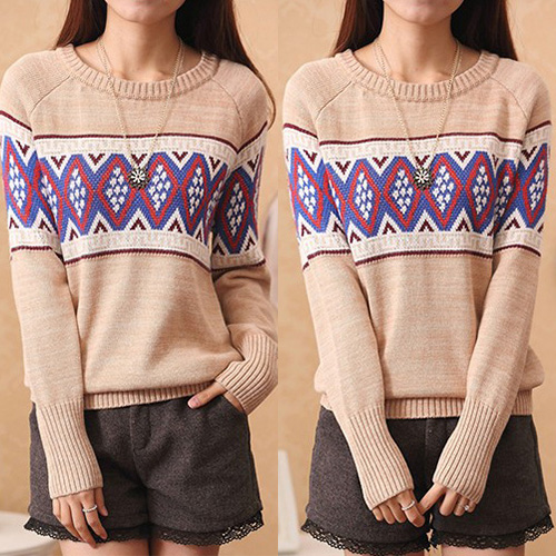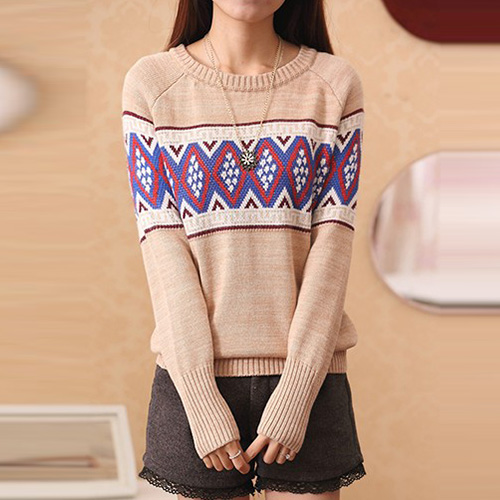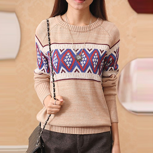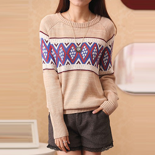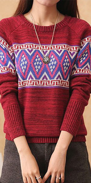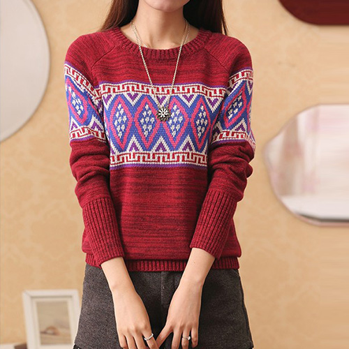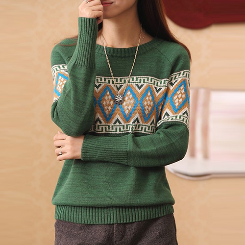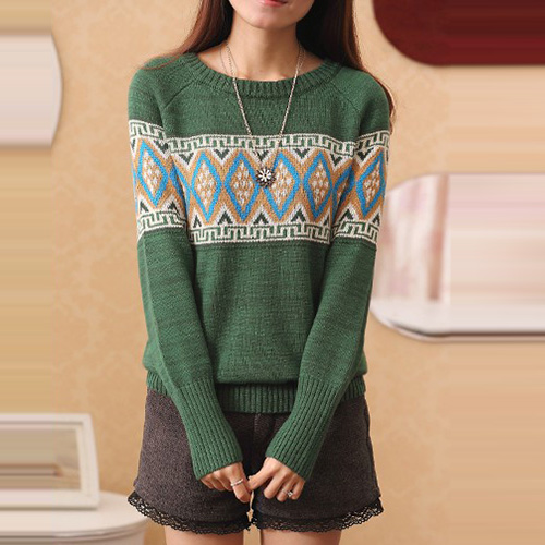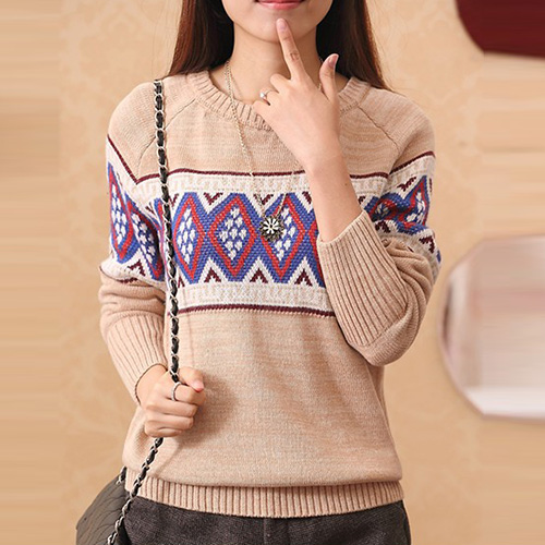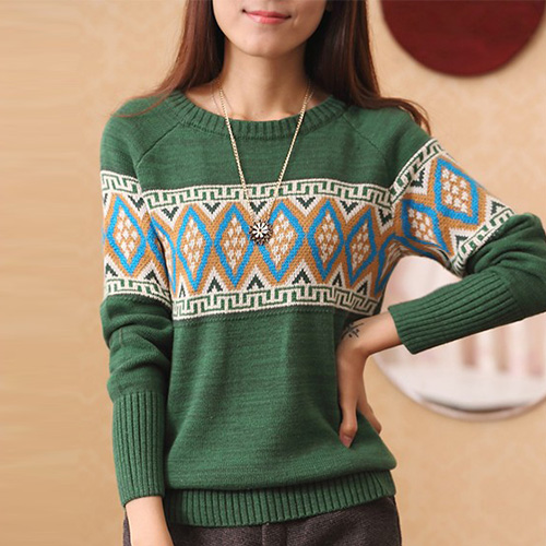 Trendy Rhombus Printed Long Sleeve Round Neck Knit Sweater