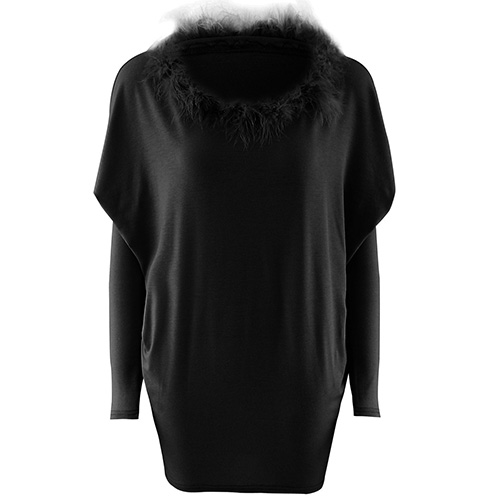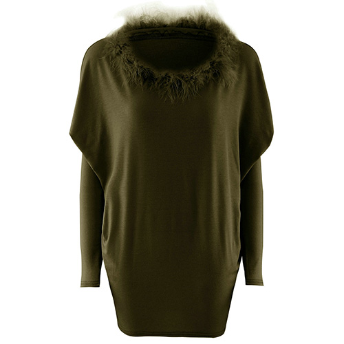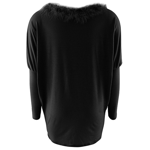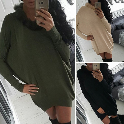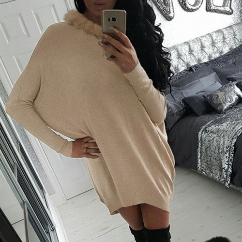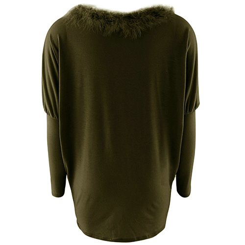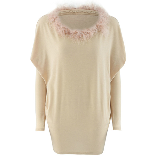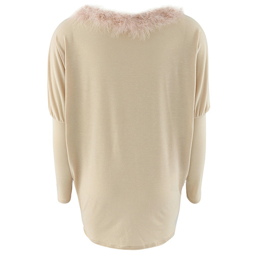 style is accompanied with round neck, bat sleeve and artificial fur collar design; render you a concise