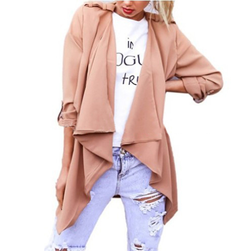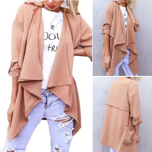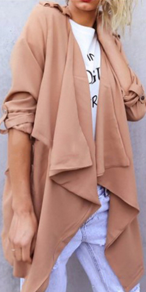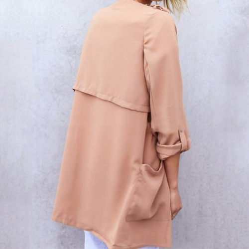 with this trench coat. Solid color style, it boasts button-tab sleeve and irregular hemline design