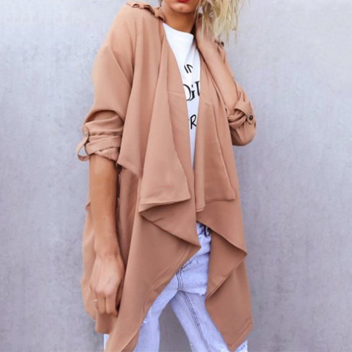 Trendy Solid Color Button-tab Sleeve Irregular Hemline Trench Coat For Women