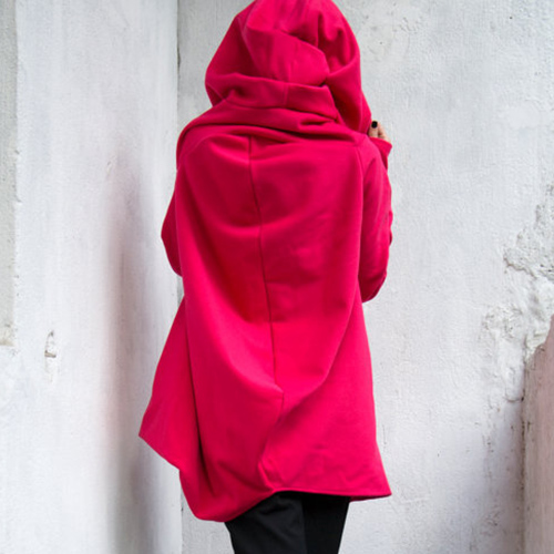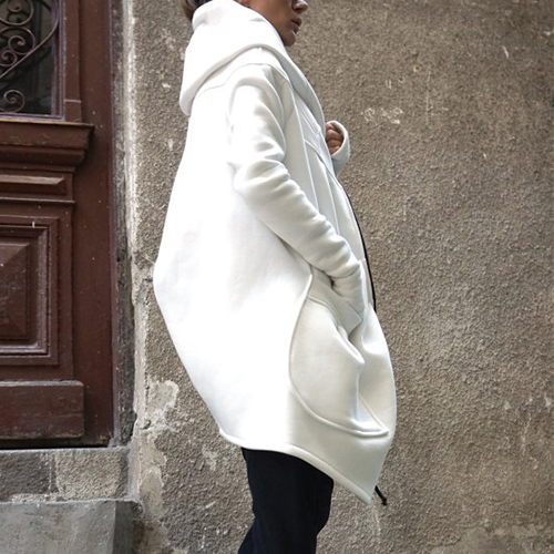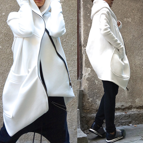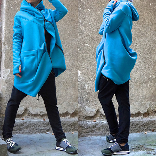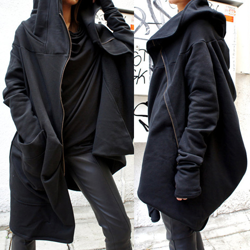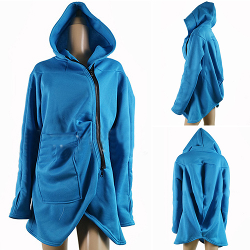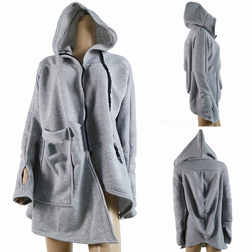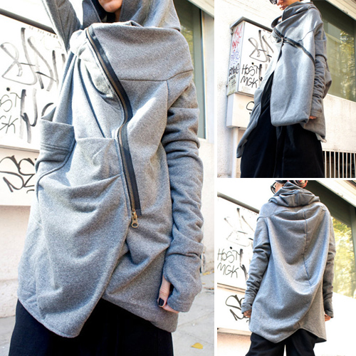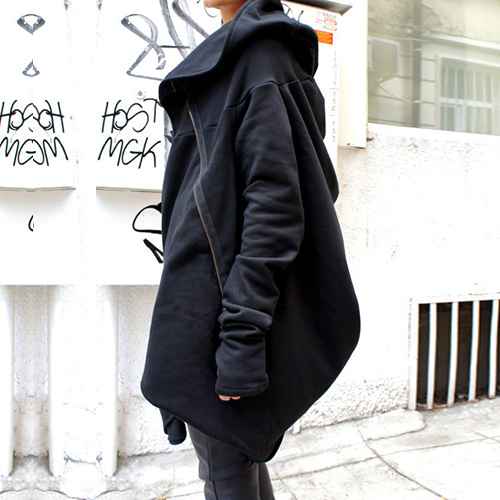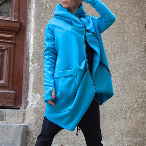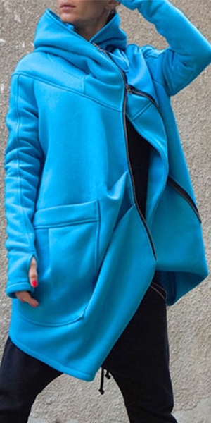 long sleeve, hooded and oblique zipper design, the side pocket and irregular hemline details make