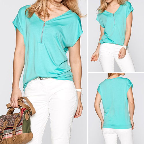 Zipper v-neck design can make your chest more sexy. Solid color style, v-neck and short sleeve design, simple but trendy.