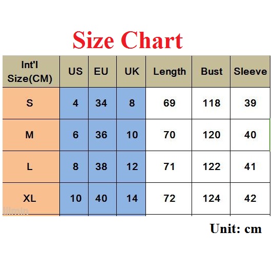 XL : Bust : 124cm(48.82"); Sleeve : 42cm(16.54"); Length : 72cm(28.35");