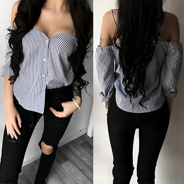 Sexy Off-shoulder Long Sleeve Sling Striped Blouse