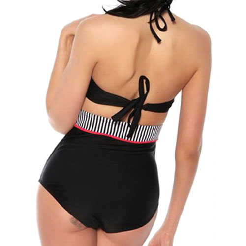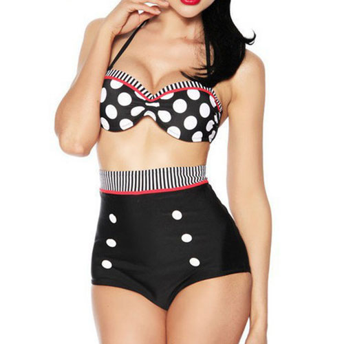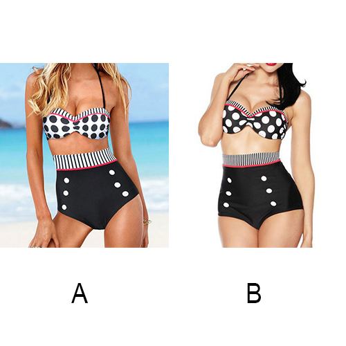 Showcase your sun-kissed skin in this polka dots and stripes bikini top.Wear yours with the matching high waisted briefs,adjusting the self-fastening halterneck and back strap for the perfect fit.