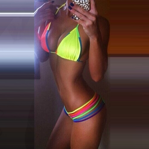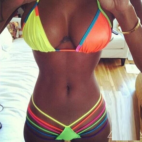 Colorful contrast color design makes this bikini look so charming and sexy. Adjustable neck