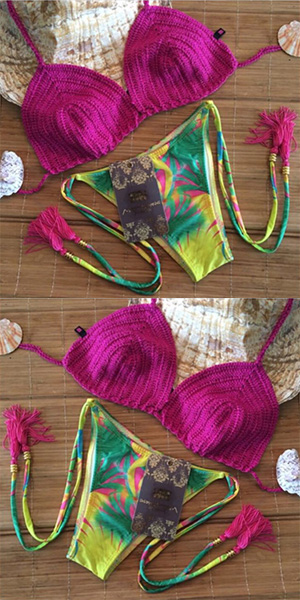 Such a sexy and chic bikini set. Knitted style bra and floral print triangle pants.