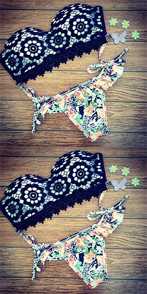 Sexy Lace Spliced Floral Print Bandeau Bikini Set