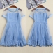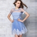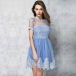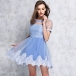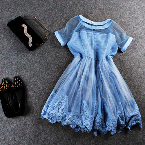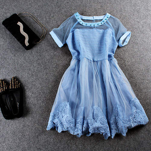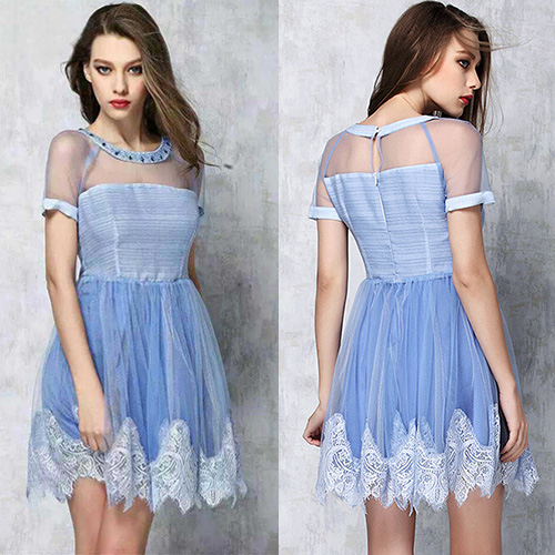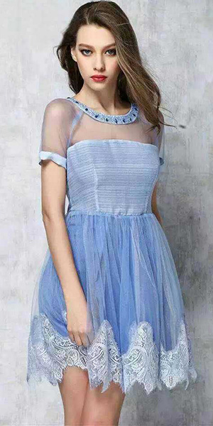 a round neck,neckline with rhinestone for decoration,so bling and ornate. Gauze and lace spliced