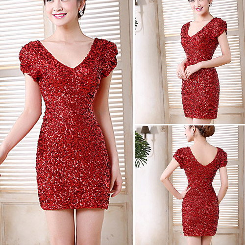 Obviously you will be the focus in this sequins dress. It features red color,jubilant and happy. Sexy v-neck,short sleeve and sequins decoration. Slim fit and package hip design,perfect outline your charming curve. Pair it with your red shoes.