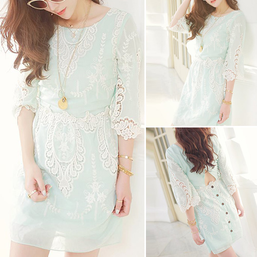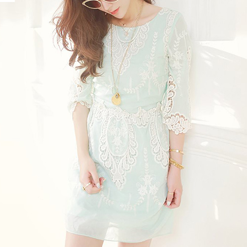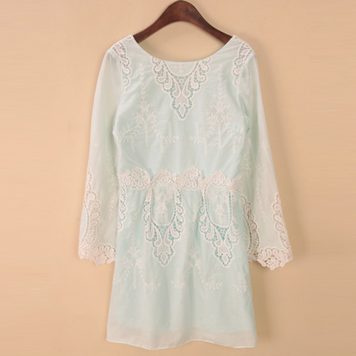 Fashion 3/4 Sleeve High Waist Lace Embroidery Chiffon Dress