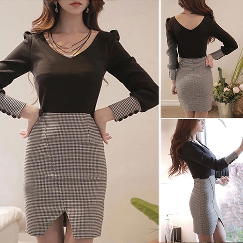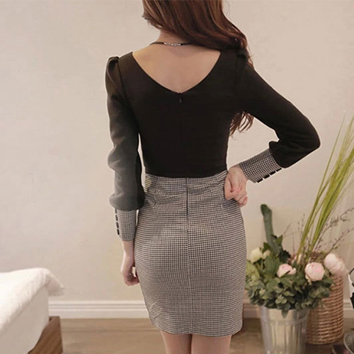 Features contrast color style,with Houndstooth pattern,fashion and charming. Round neck,long sleeve and cuff with decorative buttons. Gathered waist,slim fit and package hip design,perfect show your seductive curve.