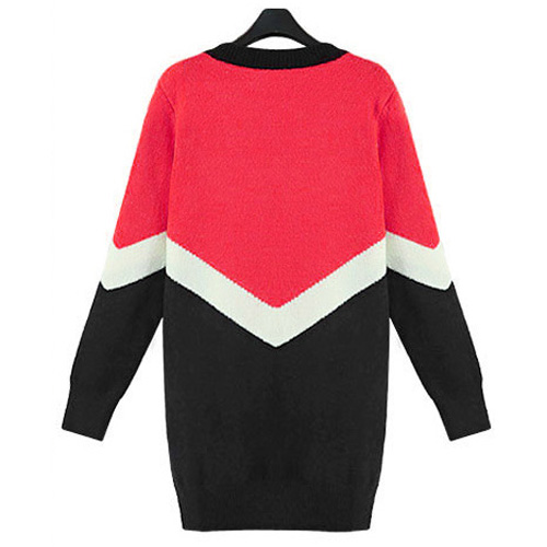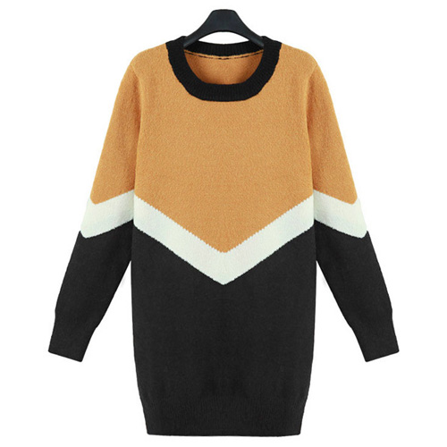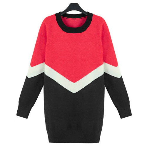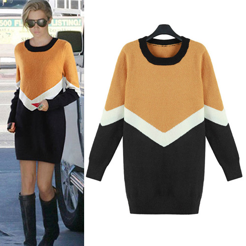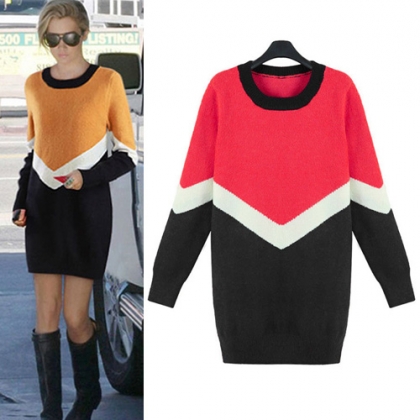 Fashion Contrast Color Long Sleeve Round Neck Knitted Dress