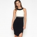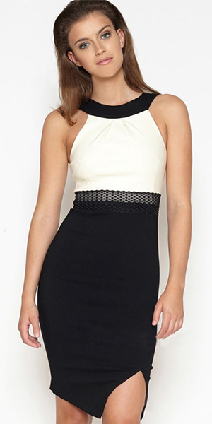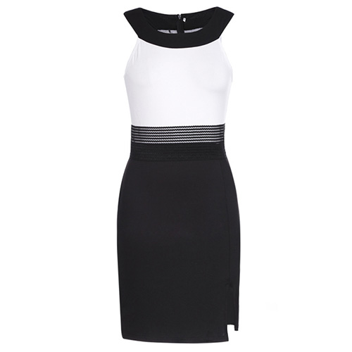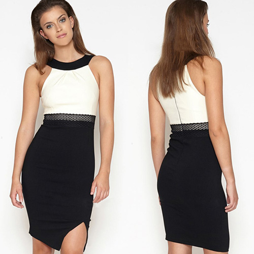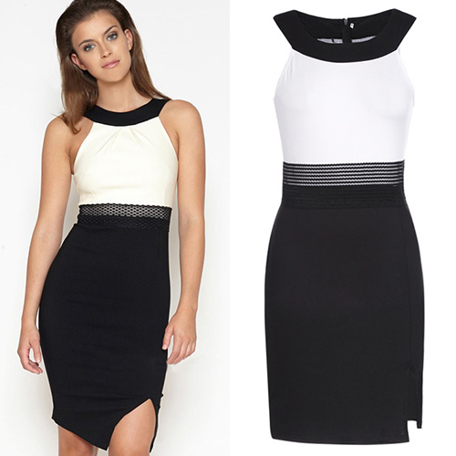 This sleeveless bodycon dress features white and black,classical and stylish. Slit hemline design