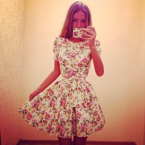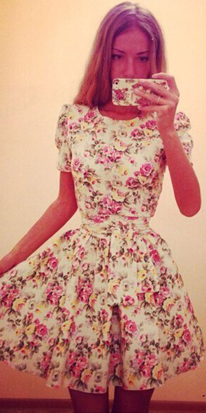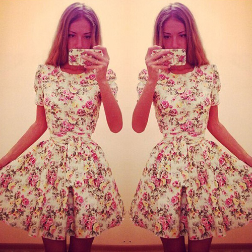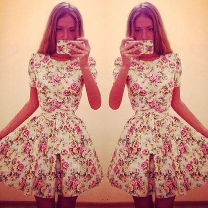 Bloom your beauty with this floral print dress! It features short sleeve,round neck