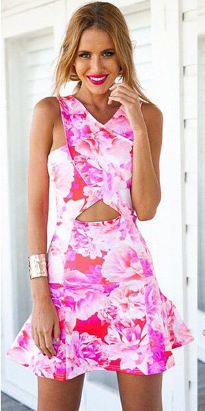 A knee-length floral dress will wear just as well at backyard barbecues and garden parties as summer weddings