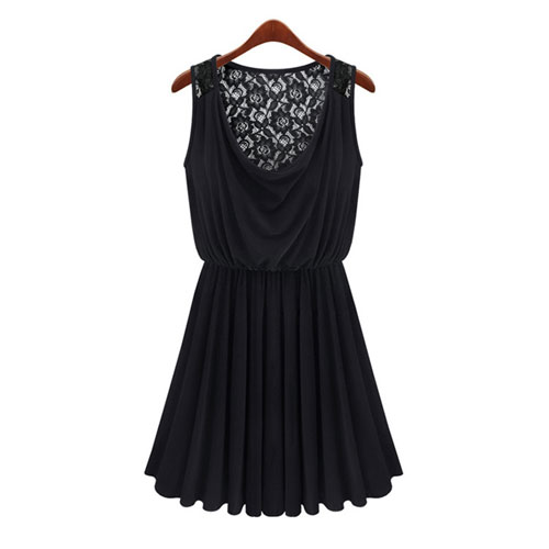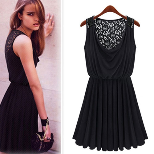 If you don’t already have a sexy little black dress in your closet, well, what are you waiting for? Black is a flattering color. Featuring hollow out lace spliced in back part and flowing pleated hemline. Paired with a sexy high-heel shoes, a charming hairdo, and red lips? Irresistible.