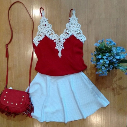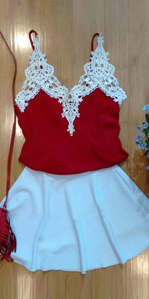 Two-piece style,including a sling tops and a solid color skirt. Tops with lace spliced design