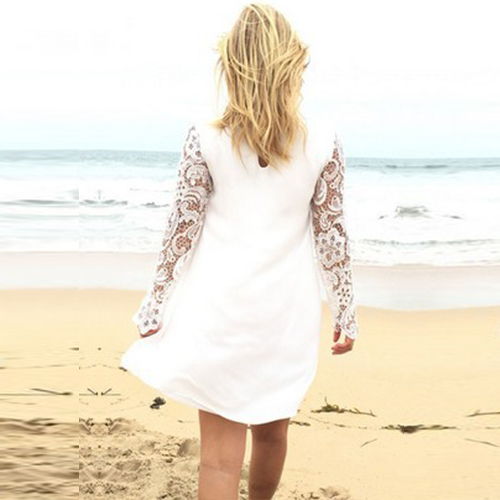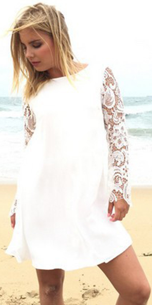 It features lace spliced long sleeve,round neck and a loose silhouette. Slip into this dress and