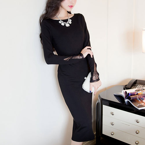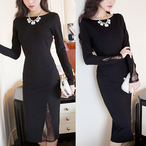 Hemline and cuff with lace spliced design,adding its feminine and sexy flavor.