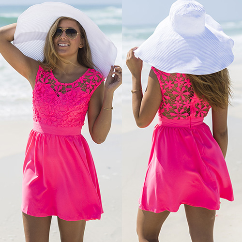 This dress features bold color,making it so eye-catching. Hollow out lace spliced design