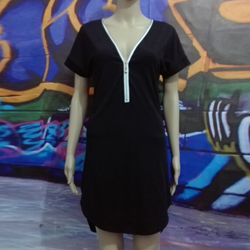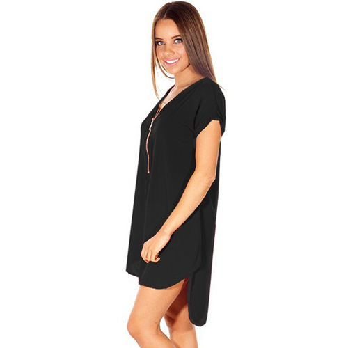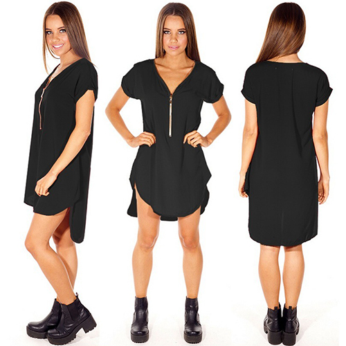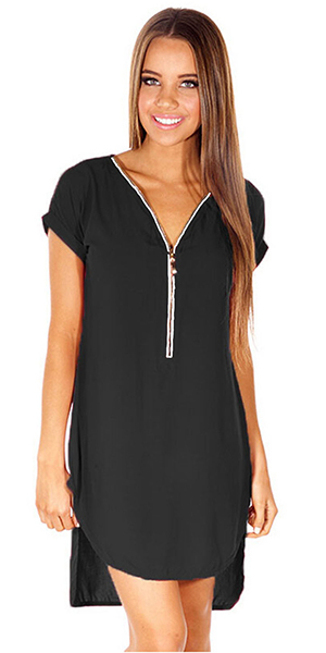 Features flattering black color,its metal zipper v-neckline and high-low hem design