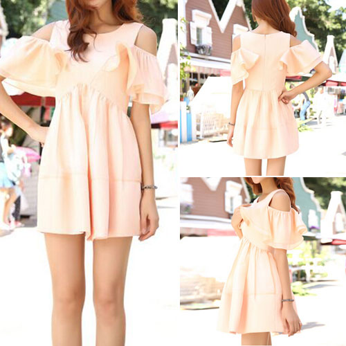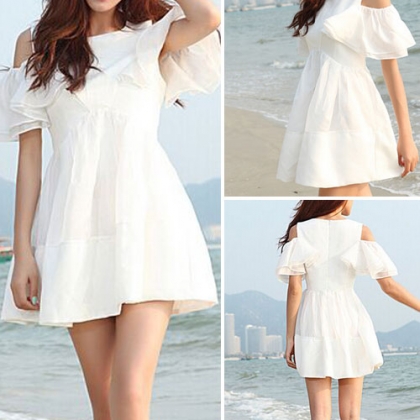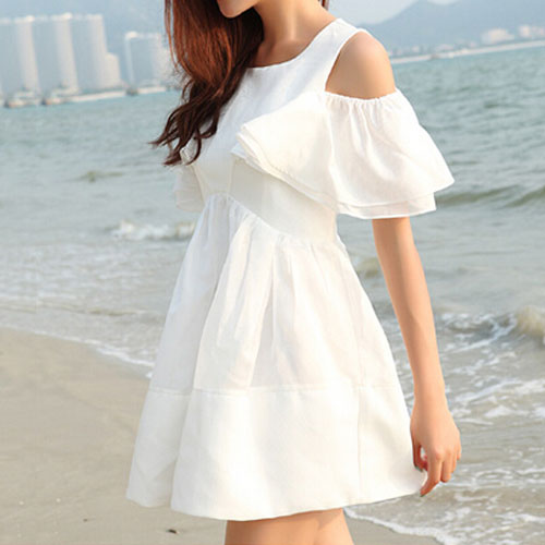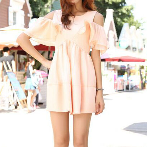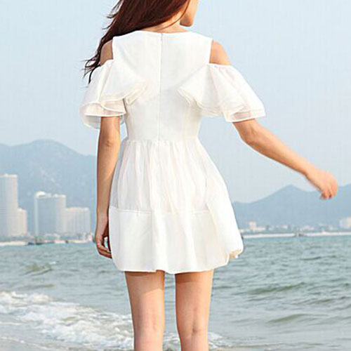 You would be regret if you missed this dress. Featuring flowing flouncing design in chest part,with elastic lotus sleeve. Exquisite and slim tailor and flowing hemline show your charming curve. Style it with a sun straw hat and a sunglass to enjoy your happy seaside time.