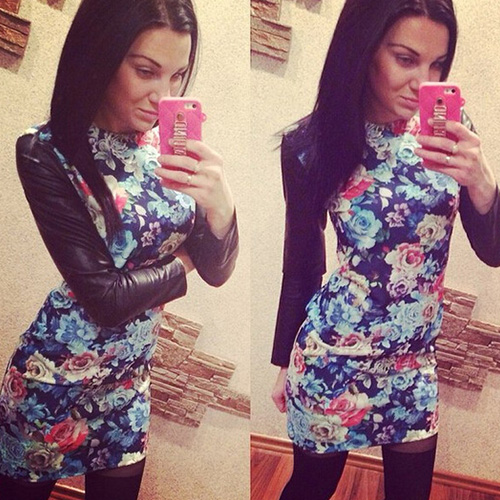 This dress is characterized by PU leather spliced long sleeve design,with floral print pattern,sweet and fashion.