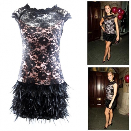 Fashion Sleeveless Round Neck Feather Hemline Lace Dress