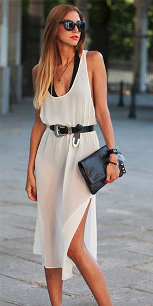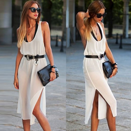 This dress features solid color style,with sleeveless,round neck and slit hemline design,