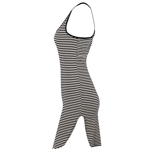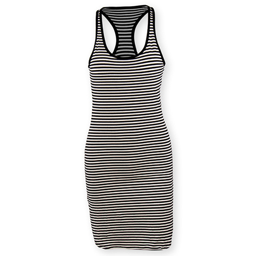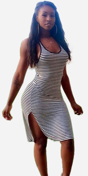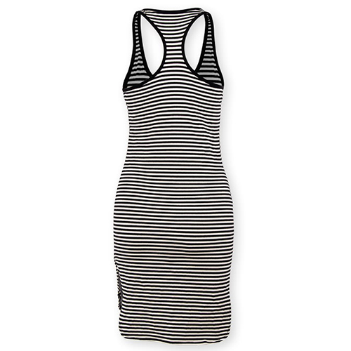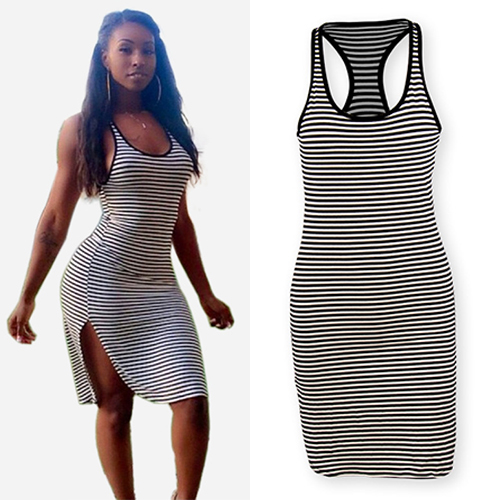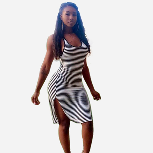 Sleek sophistication is well within your reach with this sleeveless dress. It features striped style,
