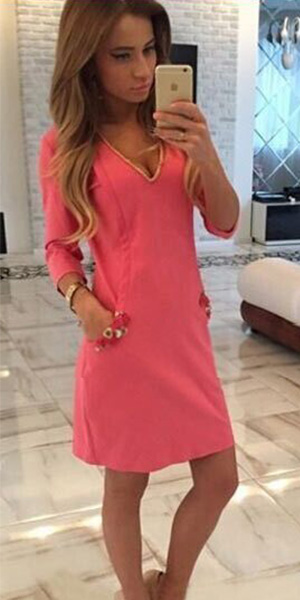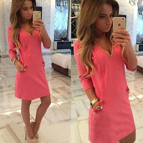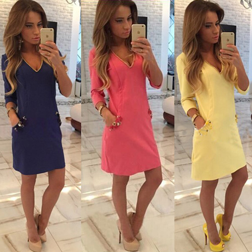 Solid color style,with 3/4 sleeve and v-neck design. And its slanted front pockets makes it
