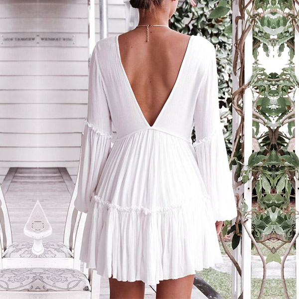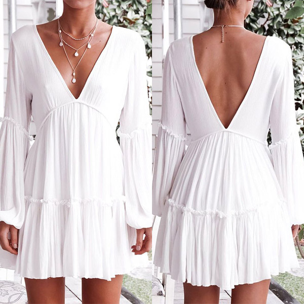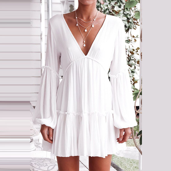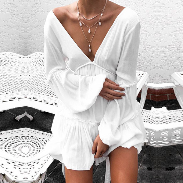 Taking this dress walking on the beach,such a beautiful and charming scenery!This dress features solid color style,with bat sleeve,v-neck and pompoms hemlinedesign. Seaside BBQs? Weekend trip? This dress would be your perfect partner.