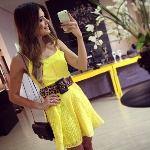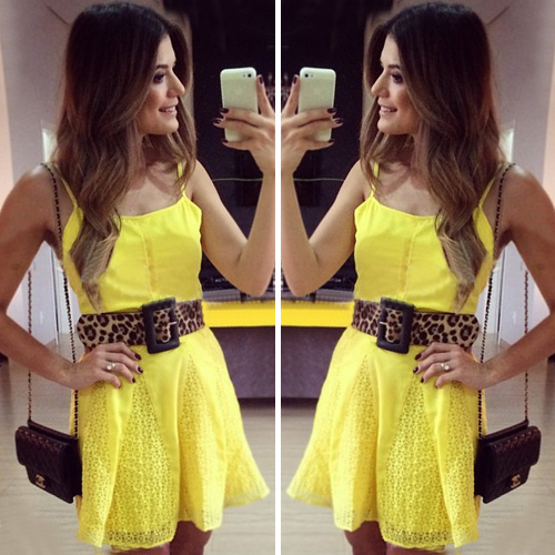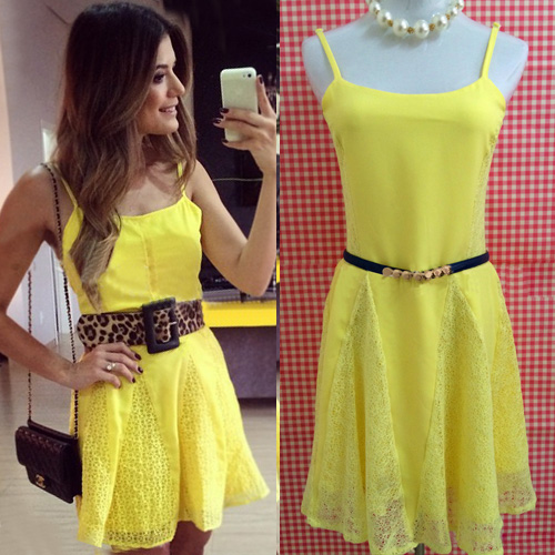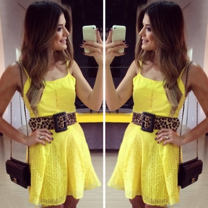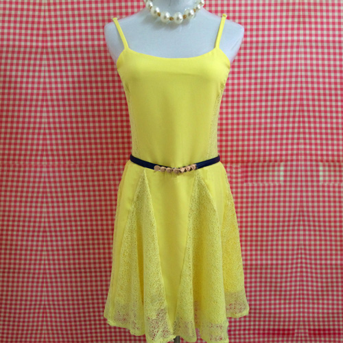 This dress features bright yellow color. Sling style,hemline with lace spliced design,