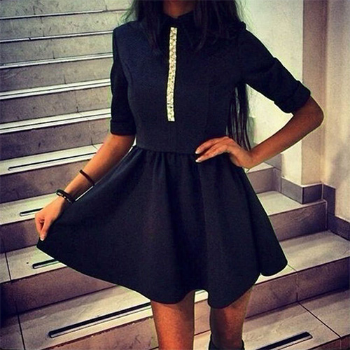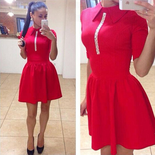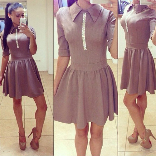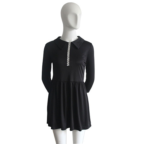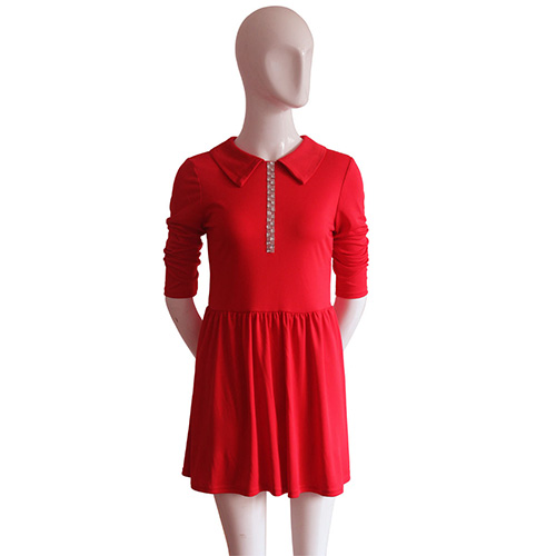 This dress features solid color style,fashion and dignified. Sweet POLO collar design,with rhinestone for decoration,dazzling and glamorous. Long sleeve,high waist design,perfect outline your slender figure.