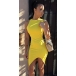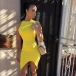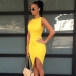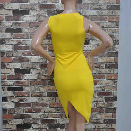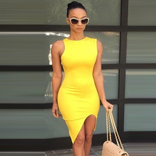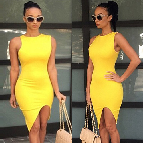 This dress features bright yellow color,can perfect set off your fair skin. Sleeveless,round neck,