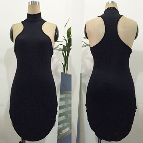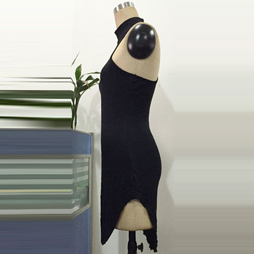 This sleeveless dress with a fit silhouette,turtleneck and an irregular hem,is a perfecy way to
