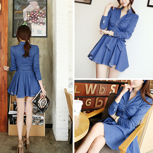 Featuring pure color jeans material,fashion and popular. Stand collar with single-breasted design,long-sleeved,and flowing big hemline. With waistbelt which you can tie it into a sweet bowknot and also help to show your slender waist. A perfect gift for yourself.