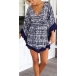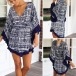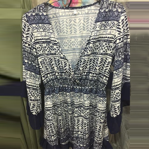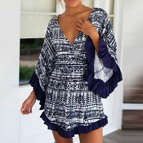 all-in-one ensemble. Features abstract floral print,with trumpet sleeve,a v-neckline and elastic