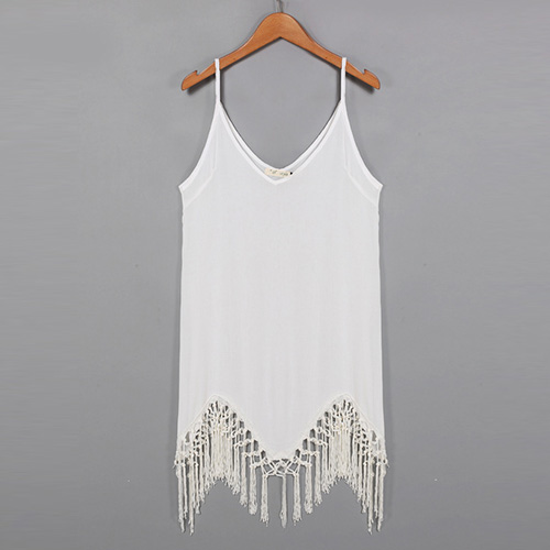with a v-neckline and irregular tassel hemline. Soft and breathable fabric makes you comfy