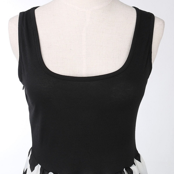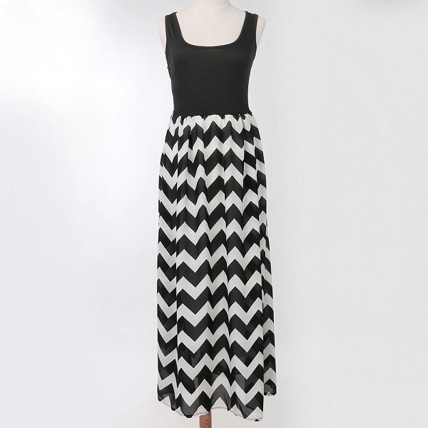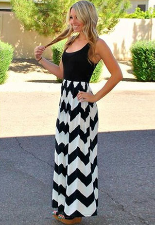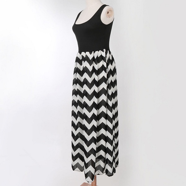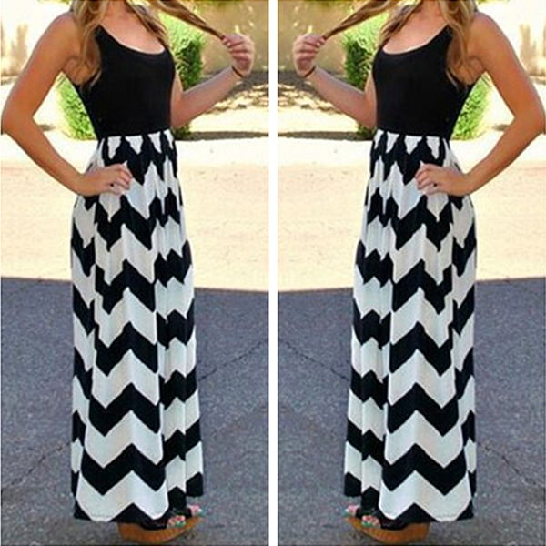 Featuring wave pattern,spliced contrast color design. Generous round neck and sleeveless design show your charming clavicle and slender arms. Floor-length hemline design. Match it with a wedge sandals.